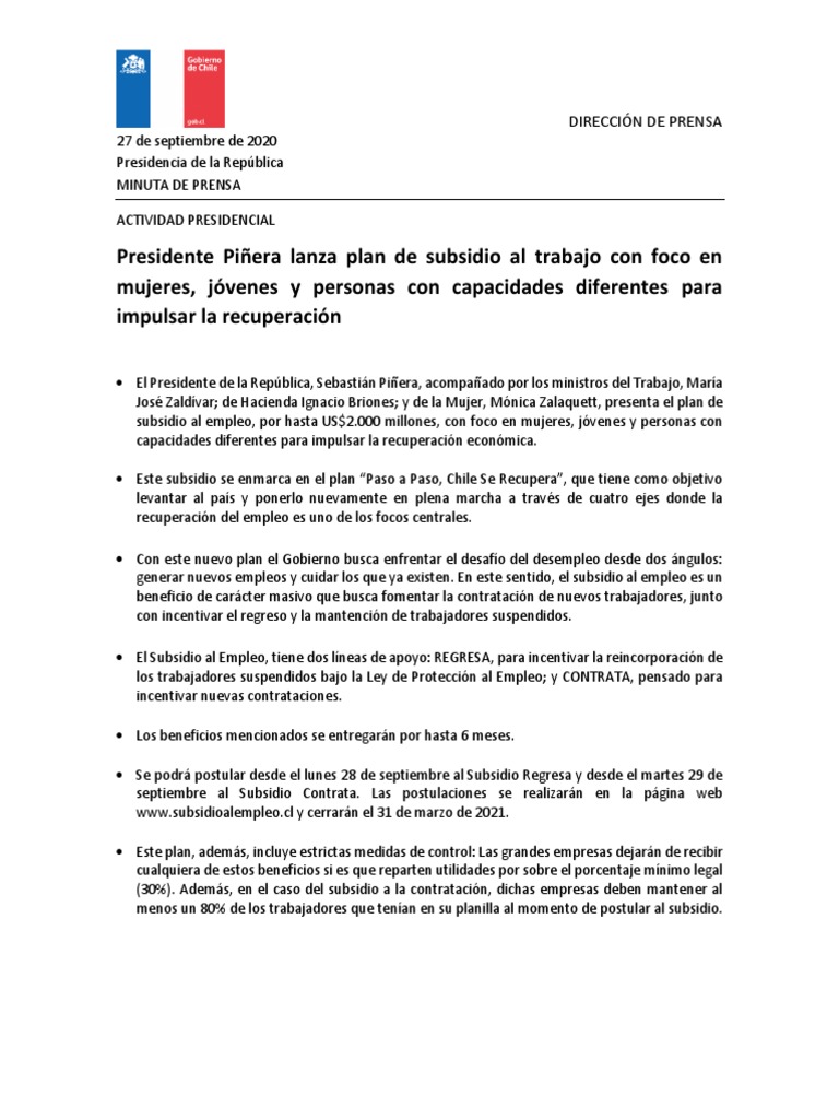 Requisitos de acceso al subsidio al desempleo. Este beneficio está destinado a personas con discapacidad, jóvenes trabajadoras y trabajadores entre 18 y 24 años de edad. El subsidio al nuevo empleo, es un ayuda económica que se entregará durante seis meses directamente a los trabajadores y trabajadoras que tengan un nuevo contrato de trabajo, siempre y cuando la remuneración mensual bruta (rmb) no exceda los $979.500 (equivalente a tres ingresos mínimos mensuales). Subsidio al nuevo empleo un beneficio que se entrega a los trabajadores(as) que inicien un nuevo contrato de trabajo May 30, 2021 · sobre las postulaciones, katherine kingma comentó, "estamos muy satisfechos porque ya hay muchas postulaciones al subsidio al nuevo empleo y quiero recalcar que es un apoyo directo a los trabajadores que tengan un nuevo empleo desde el 1 de abril, entregando $50.000 directamente al trabajador si es hombre y $70.000 en el caso de ser mujer.